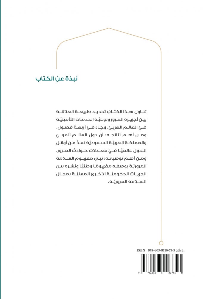 تناول هذا الكتابُ تحديد طبيعة العلاقة بين أجهزة المرور ونوعيَّة الخدمات التأمينيَّة في العالم العربي. وجاء في أربعة فصول. ومن أهم نتائجه: أن دول العالم العربي والمملكة العربيَّة السعوديَّة تعدُّ من أُوليات الدول عالميًّا في معدلات حوادث المرور. ومن أهم توصياته: تبني مفهوم السلامة المروريَّة بوصفه مفهومًا وطنيًّا ونشره بين الجهات الحكوميَّة الأخرى المعنيَّة في مجال السلامة المروريَّة.
